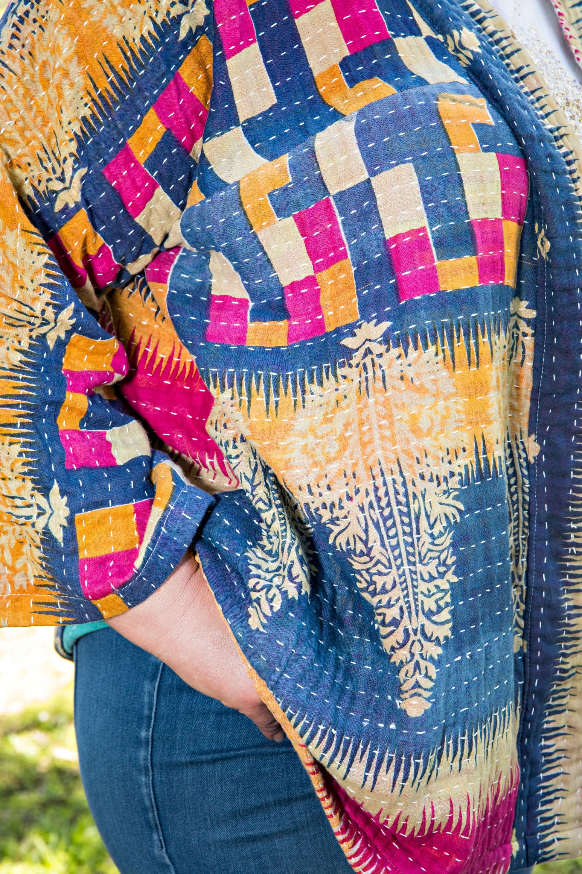 This is one of the most beautiful, handcrafted pieces of clothing that I have ever purchased. I love the story behind the upcycled sari fabric which I feel gives this jacket the edge on anything else I own. Nick has not only selected wonderful sections of the fabric but has created a beautiful contrast with two different sari fabrics. This jacket is perfect for sitting on the deck during Fall/Winter and drinking a coffee. I absolutely love it!